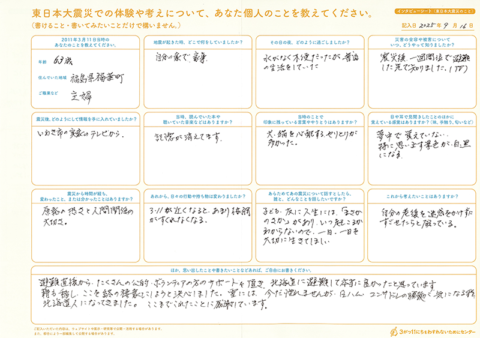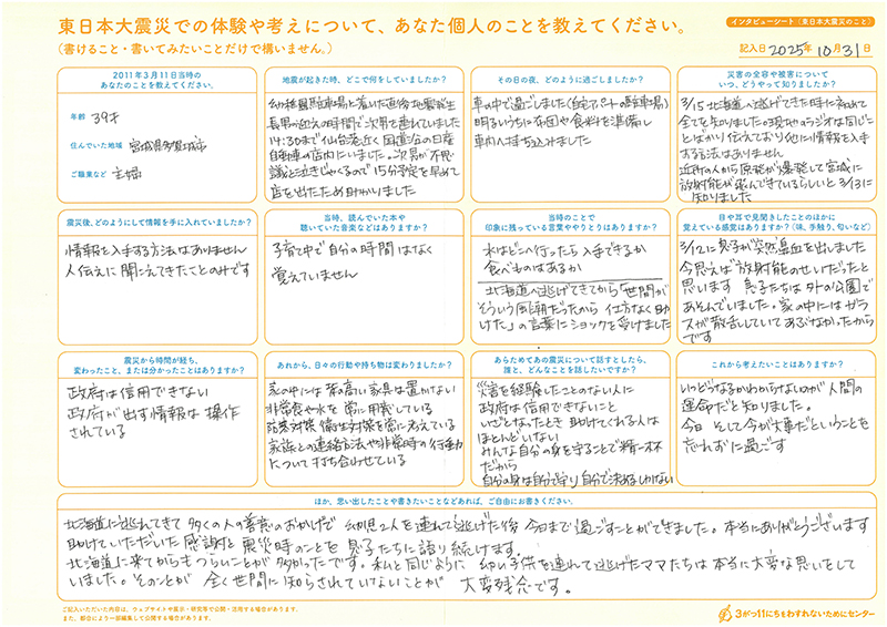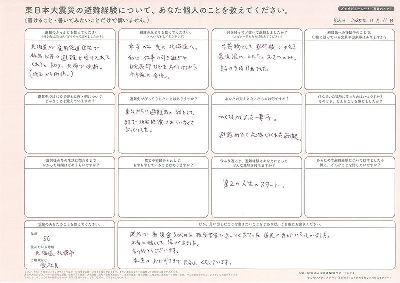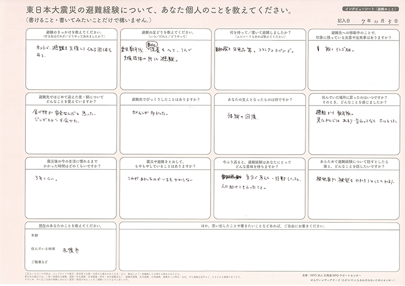 今年度わすれン!では、北海道で避難者支援事業に取り組むNPO法人北海道NPOサポートセンターと協働で、東日本大震災での避難経験を書きのこせる「インタビューシート(東日本大震災 避難のこと)」を作りました。