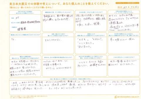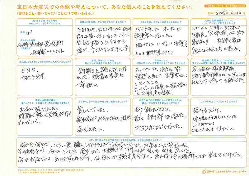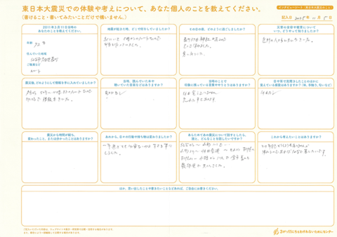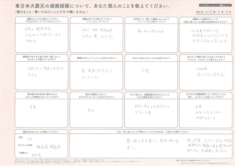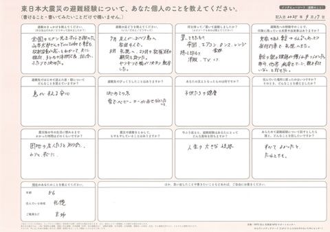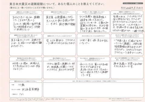 今回、北海道NPOサポートセンターでは、主に北海道へ避難した方へ、インタビューシート(東日本大震災のこと)とインタビューシート(東日本大震災 避難のこと)の2種類をお送りしました。この記事では、2種類のシートをとおして書きのこされた、震災当時のこと、そこからの避難の記憶を紹介します。